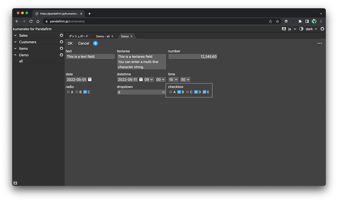 checkboxフィールドを配置したフォームを開き、項目を選択します。