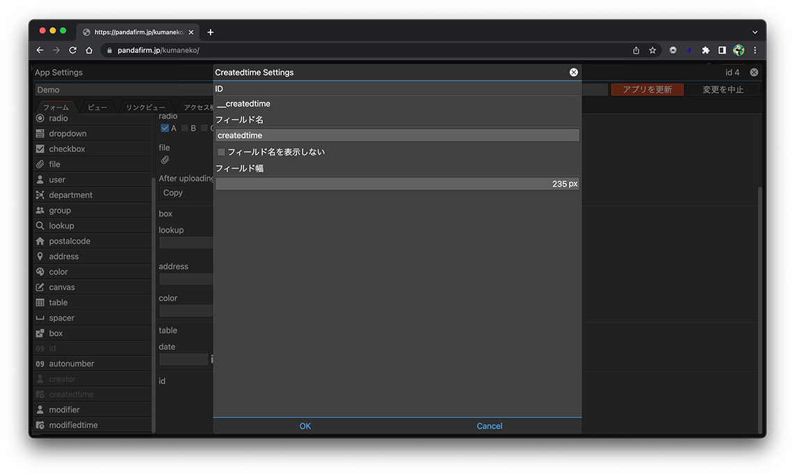 createdtimeフィールドは、レコードが最初に保存された日時が自動で設定されるフィールドです。フォームに配置したフィールド上の歯車ボタンを押下すると表示される画面から、利用目的に合った設定をして下さい。