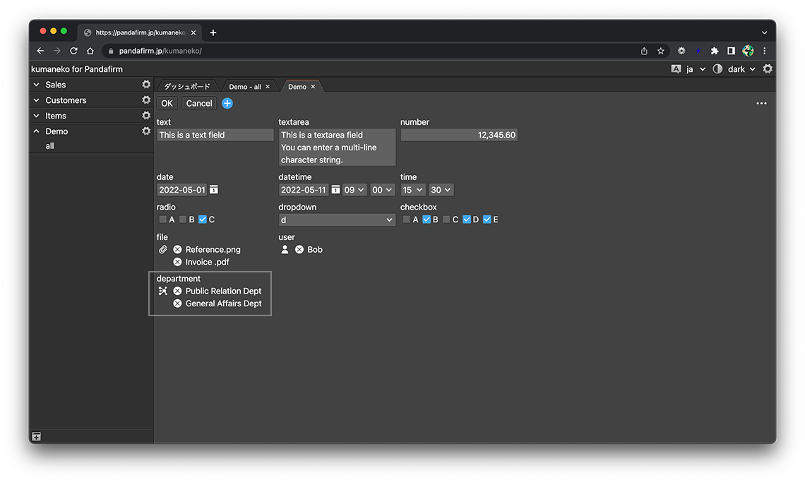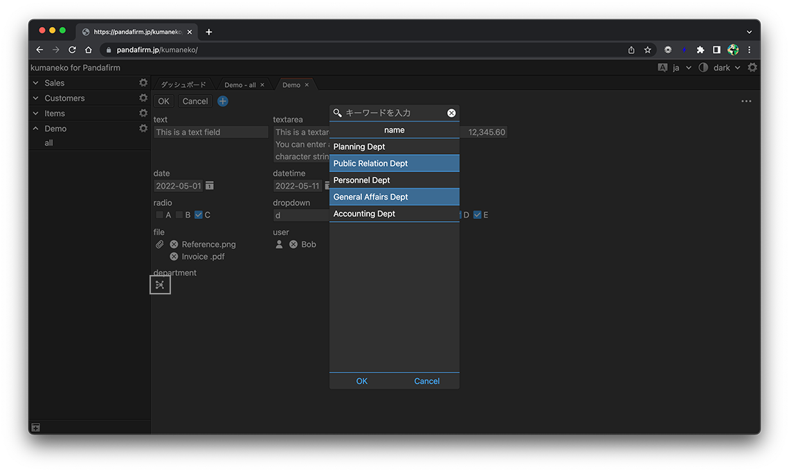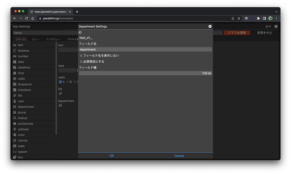 departmentフィールドは、登録済み組織を複数選択するフィールドです。フォームに配置したフィールド上の歯車ボタンを押下すると表示される画面から、利用目的に合った設定をして下さい。