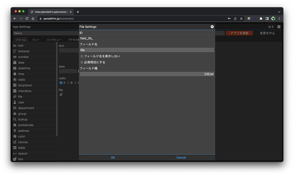 fileフィールドは、ファイルをアップロードするフィールドです。フォームに配置したフィールド上の歯車ボタンを押下すると表示される画面から、利用目的に合った設定をして下さい。