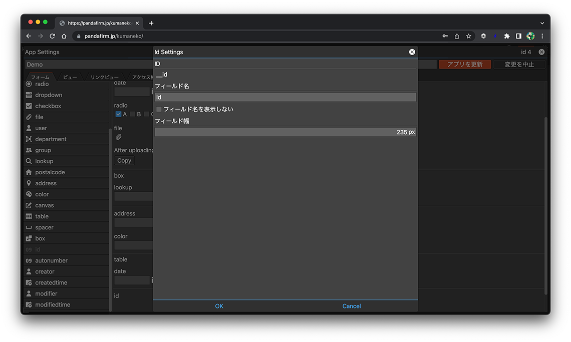 フィールドのDOM要素を取得したり、レコードを操作したりといったカスタマイズを行う場合は、このIDを使用します。
