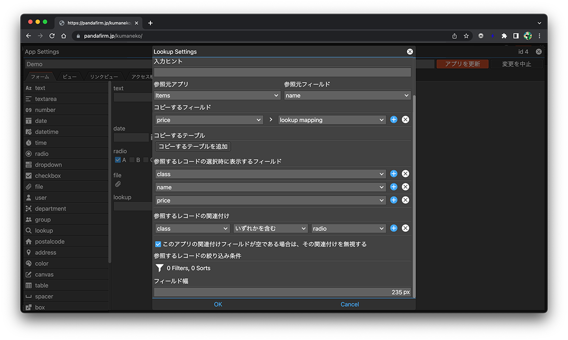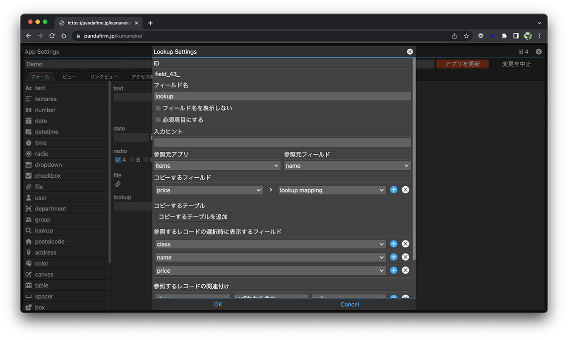 lookupフィールドは、他のアプリのレコード情報をコピーするフィールドです。フォームに配置したフィールド上の歯車ボタンを押下すると表示される画面から、利用目的に合った設定をして下さい。