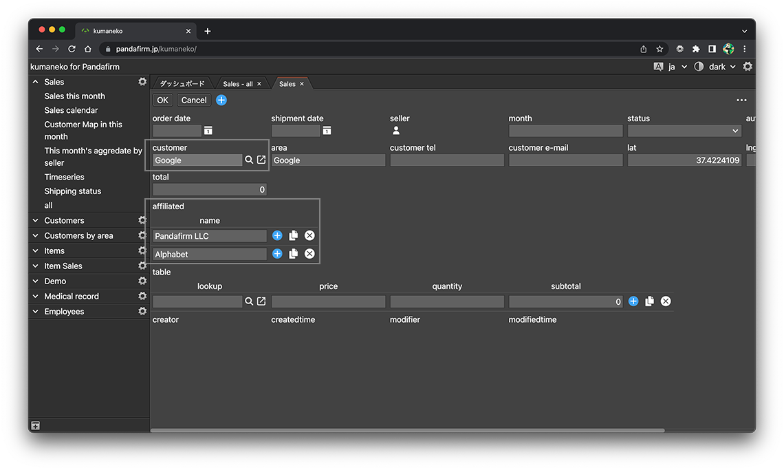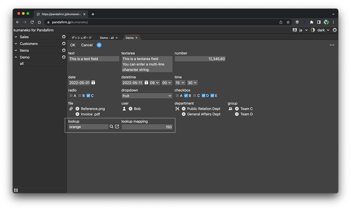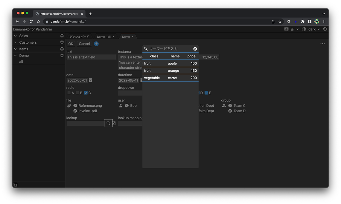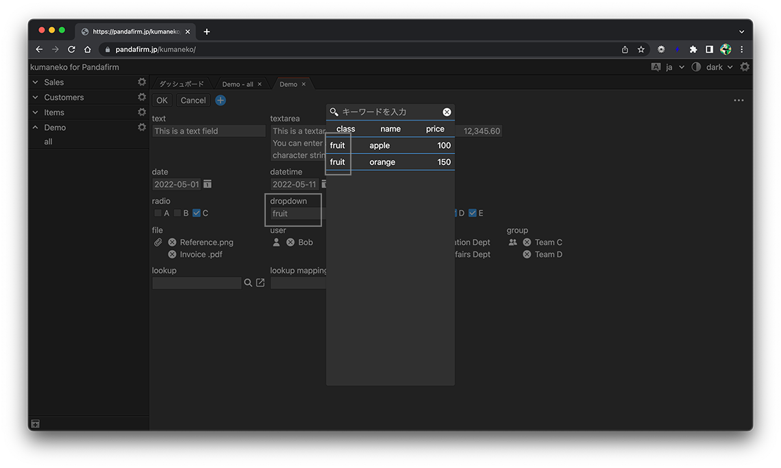 編集中のフォーム内のいずれかのフィールドとの関連付けをすると、その値に該当するレコードのみが選択画面に表示されるようになります。