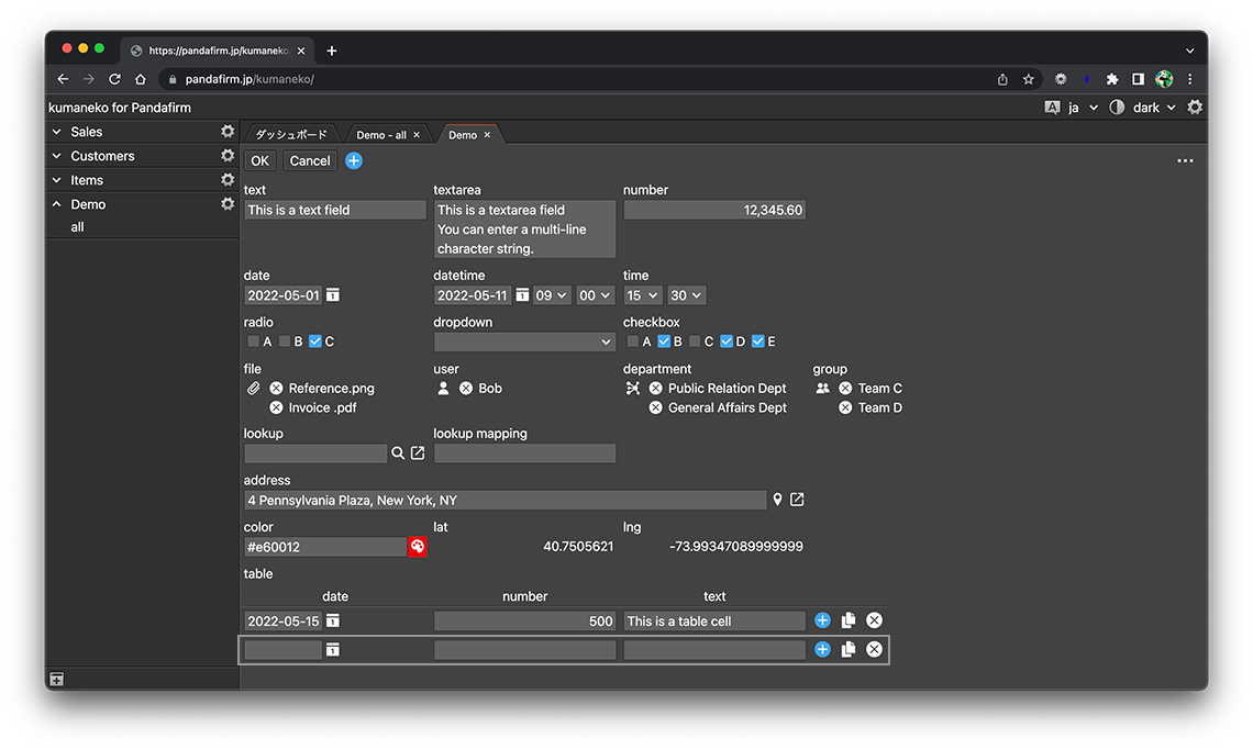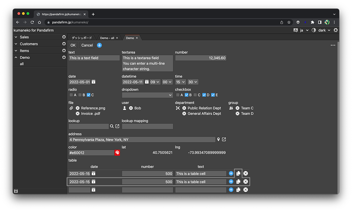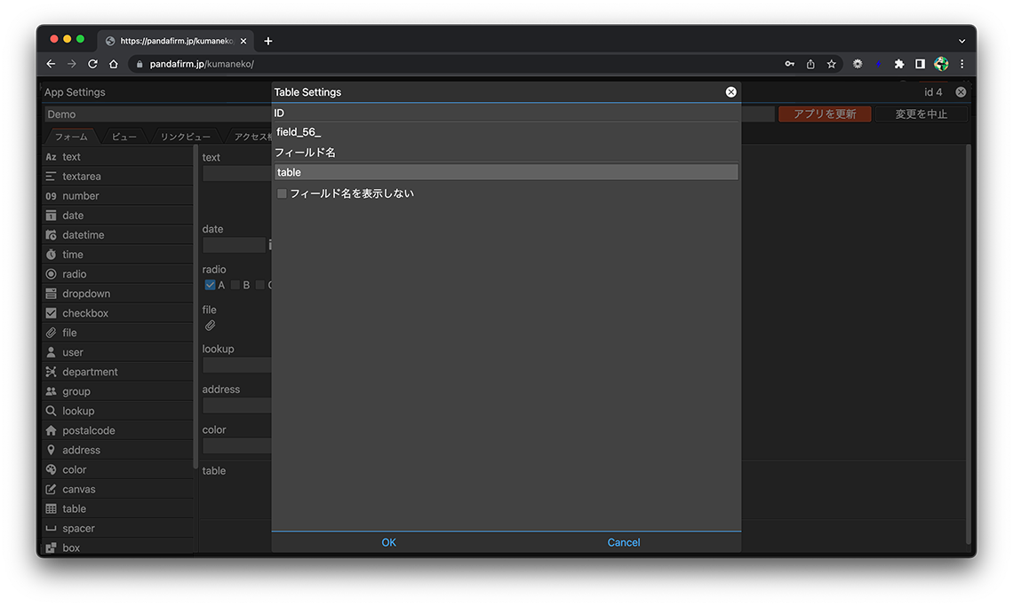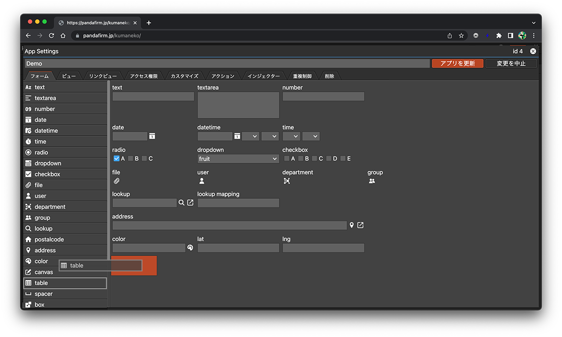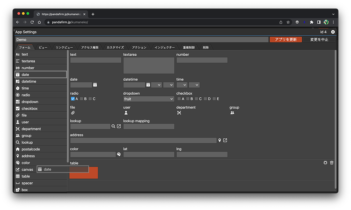 まず、tableフィールドをドラッグアンドドロップでフォームに配置します。