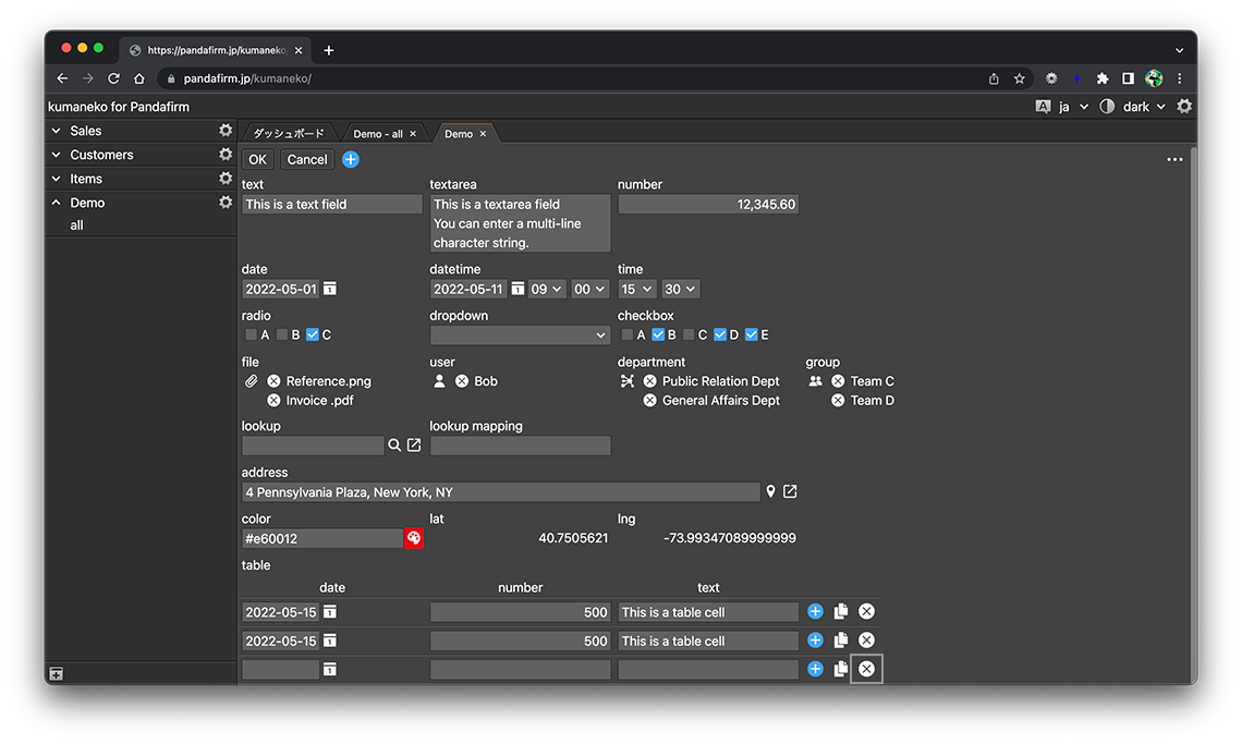 tableフィールドは、必要に応じてフィールドを配置した行を追加または削除するフィールドです。フォームに配置したフィールド上の歯車ボタンを押下すると表示される画面から、利用目的に合った設定をして下さい。