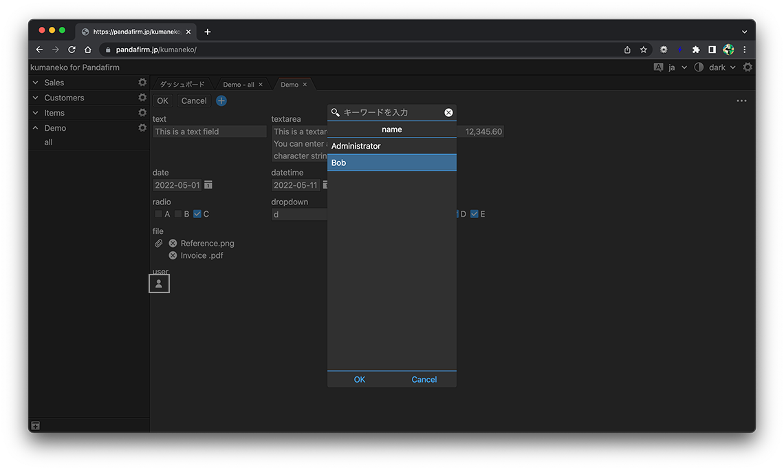 userフィールドは、登録済みユーザーを複数選択するフィールドです。フォームに配置したフィールド上の歯車ボタンを押下すると表示される画面から、利用目的に合った設定をして下さい。