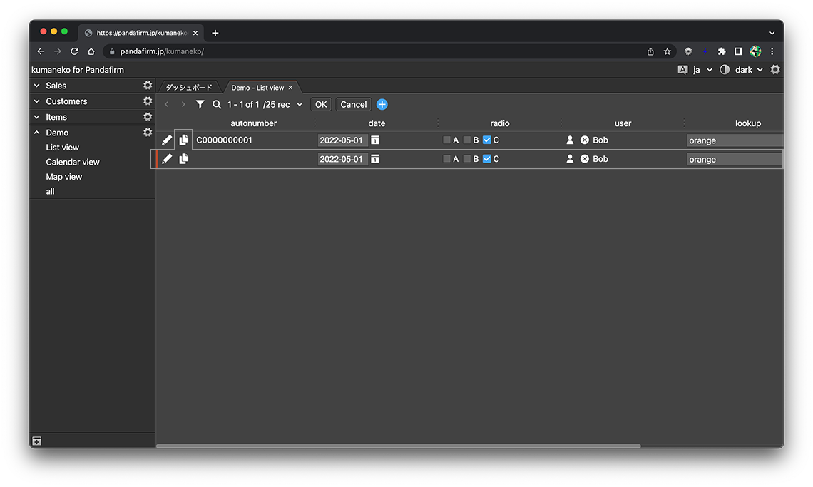 編集型一覧形式ビューにおいて、各行の複製ボタンを押下すると行が複製されます。