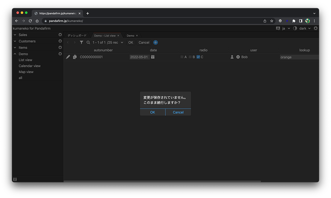 編集型一覧形式の場合は、その画面上で編集することも出来ます。
