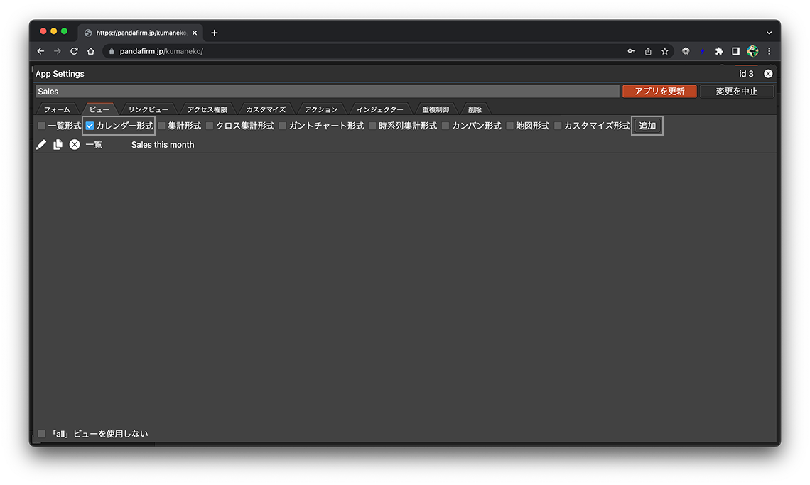 ビューの形式から「カレンダー形式」にチェックを付け、追加ボタンを押下します。