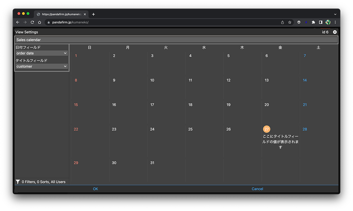 カレンダー形式のビューは、各日付のセルに該当するレコードを表示します。作成はアプリ設定画面の「ビュー」タブから行います。