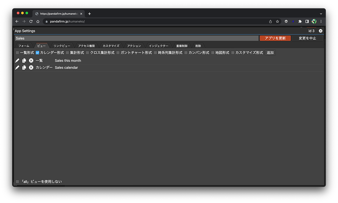画面左側のアプリ一覧から「アプリ名」 > 「ビュー名」と選択すると、作業エリアに作成したビューが表示されます。