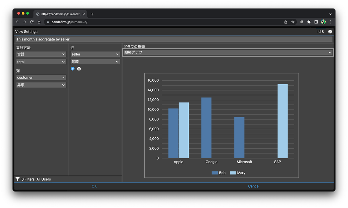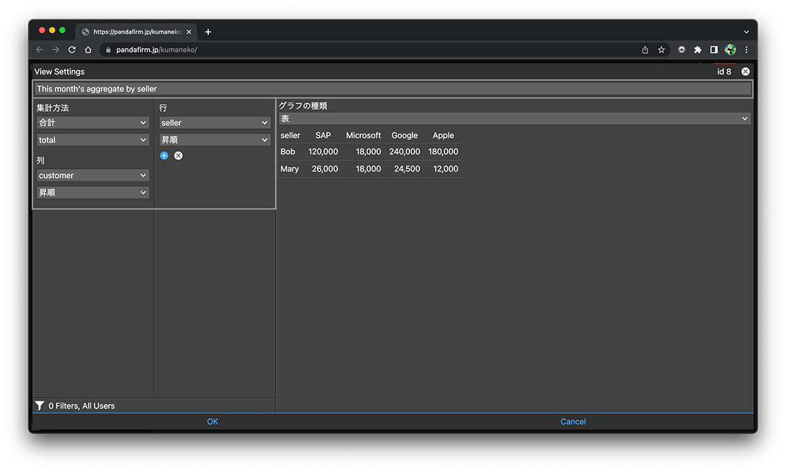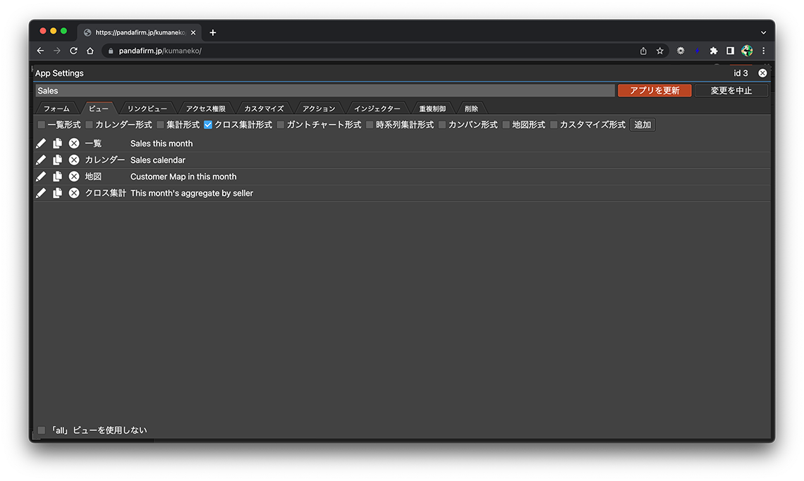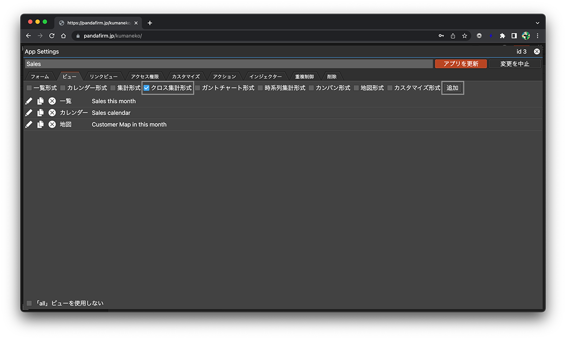 クロス集計形式のビューは、複数のフィールドでレコードを分類し、集計結果の数字を縦横に掛け合わせて表示します。作成はアプリ設定画面の「ビュー」タブから行います。